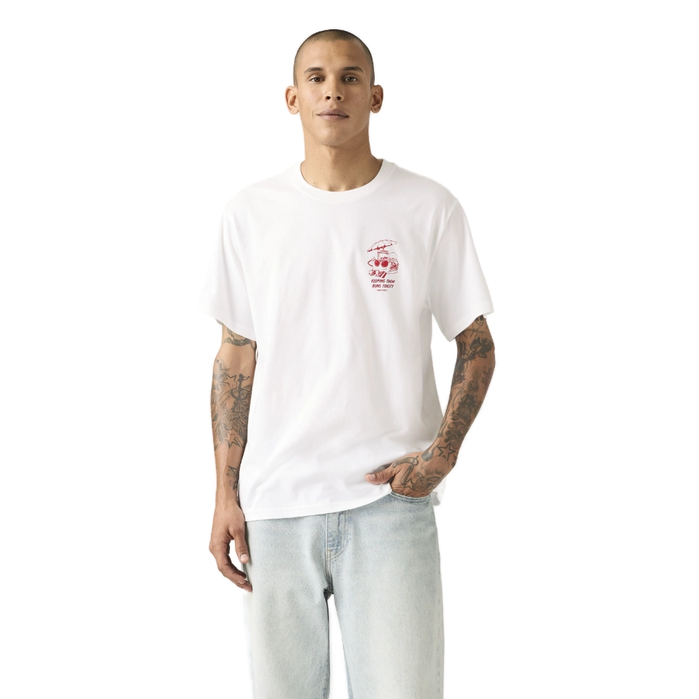 Αναβάθμισε το casual look σου με το Levi’s® SS Relaxed Fit Tee. Κατασκευασμένο από 100% premium βαμβάκι, προσφέρει απόλυτη άνεση και διαπνοή όλη τη μέρα. Διαθέτει διακριτικό λογότυπο στο στήθος, ενώ η πίσω όψη κλέβει τις εντυπώσεις με ένα μεγάλο, vintage-inspired τύπωμα που απεικονίζει burger και πατάτες, συνοδευόμενο από το μήνυμα “No substitute for the classics”. Η χαλαρή του γραμμή (relaxed fit) το καθιστά ιδανικό για layering ή για να φορεθεί μόνο του με το αγαπημένο σου denim.
